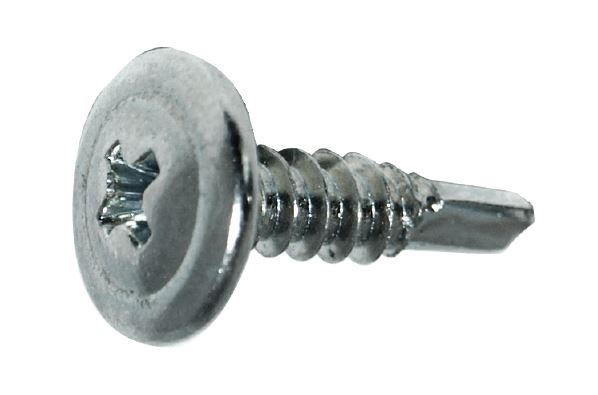 Skrutka okrasná, polguľatá hlavička s podložkou s vrtáčikom. Zinok.